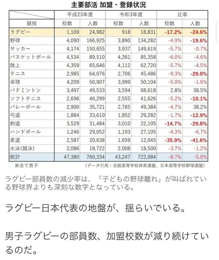 子供の野球離れは話題になるのにラグビー離れはニュースにならないな。世界の競技人口は野球より多そうなのに