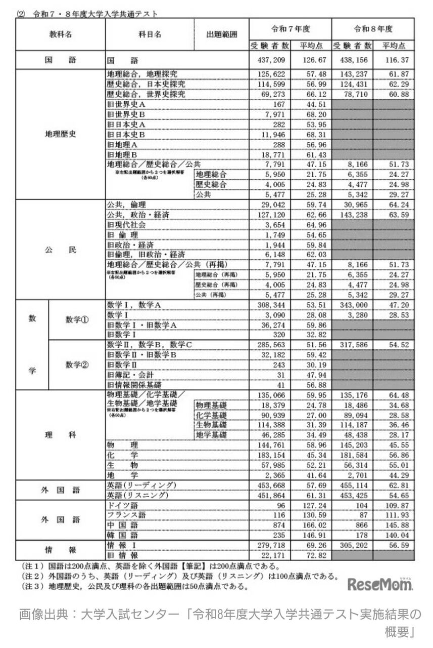「平均点等一覧」は、2026年1月17日と18日に実施された共通テスト本試験の平均点、最高点、最低点、標準偏差などのデータを集計したもの。中間集計は1月21日に発表した。大学入試センターの最終集計によると、本試験の各教科・科目の平均点は次の通り。